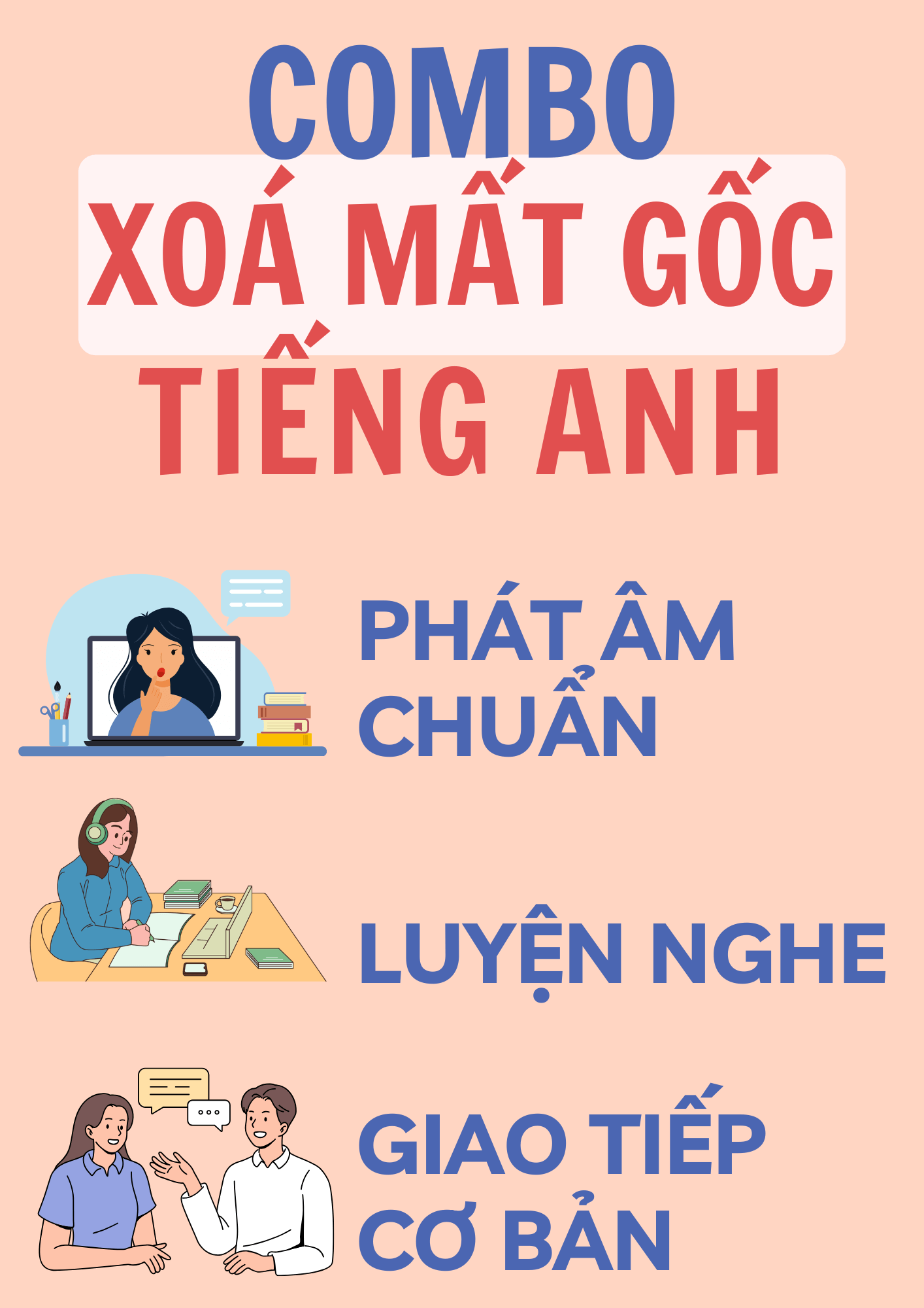 COMBO KHOÁ HỌC XOÁ MẤT GỐC của Ms Lý bao gồm 3 khoá: PHÁT ÂM CHUẨN + LUYỆN NGHE CƠ BẢN + GIAO TIẾP CƠ BẢN